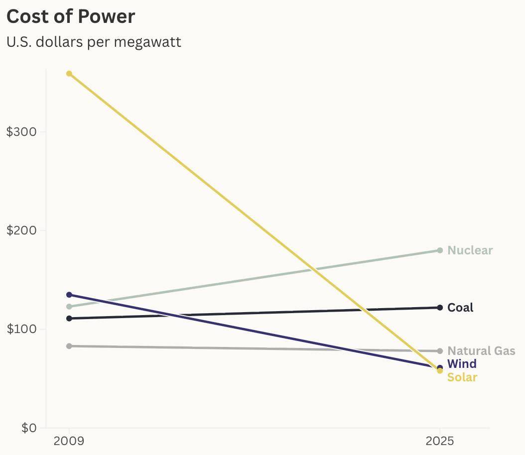 Figure 1. The cost of building, maintaining, and fueling a new power plant, without subsidies, adjusted for inflation. Prices based on combined cycle natural gas, utility-scale solar, and onshore wind. Source: Lazard. YALE ENVIRONMENT 360